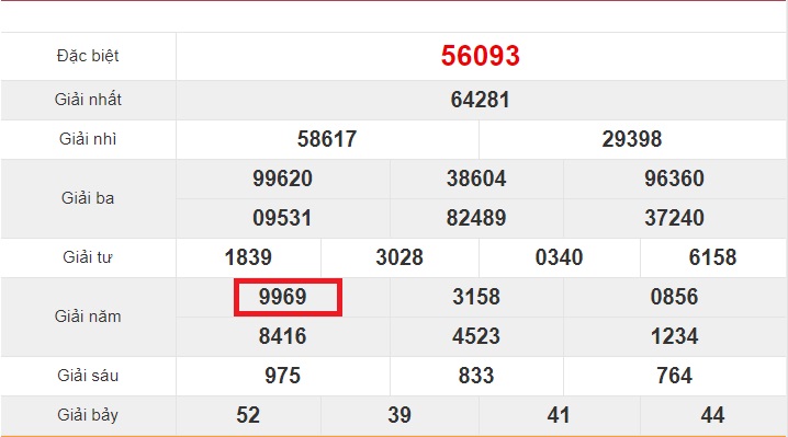 – Theo như ảnh bên trên thì giải tư xuất hiện số 9969. Giải này chỉ gồm 2 số xuất hiện duy nhất và lặp lại nhiều lần. Từ đó, bạn có ngay cặp số 69 và 96 để đánh trong ngày hôm đó.